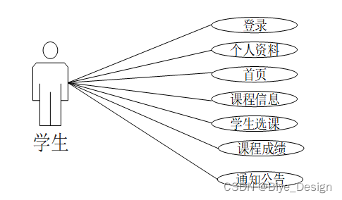 用户进入系统可以进行首页登录、课程信息、学生选课、课程成绩、通知公告功能等。学生用例如图3-8所示。