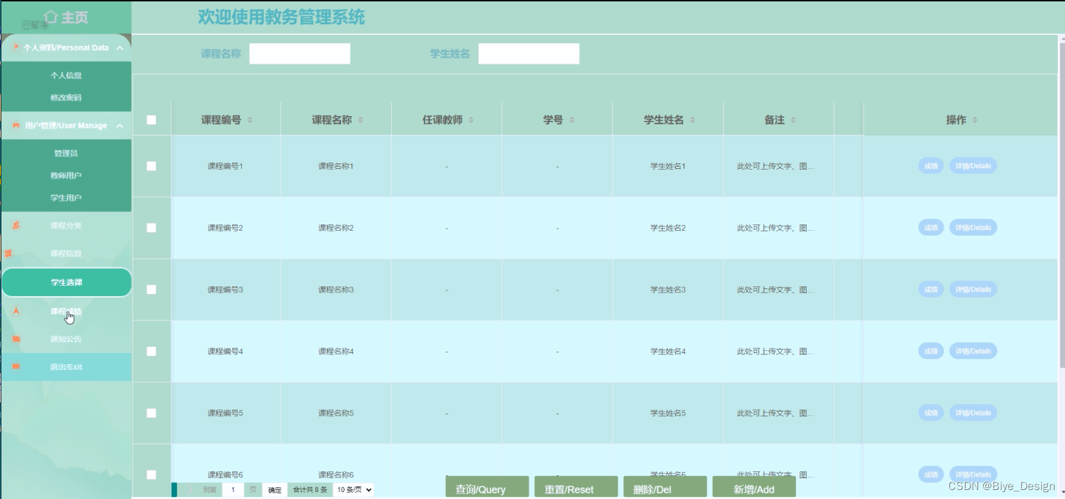 本设计主要实现集人性化、高效率、便捷等优点于一身的教务管理系统完成首页、个人资料、用户管理、课程分类、课程信息、学生选课、课程成绩、通知公告等功能模块。系统通过浏览器与服务器进行通信,实现数据的交互与变更。本系统通过科学的管理方式、便捷的服务提高了工作效率,减少了数据存储上的错误和遗漏。教务管理系统开发是采用基于 MVVM模式的ssm框架进行开发,使用 MyEclipse编译器编写,数据方面主要采用的是微软的MySQL关系型数据库来作为数据存储媒介,配合前台HTML+CSS 技术完成系统的开发。