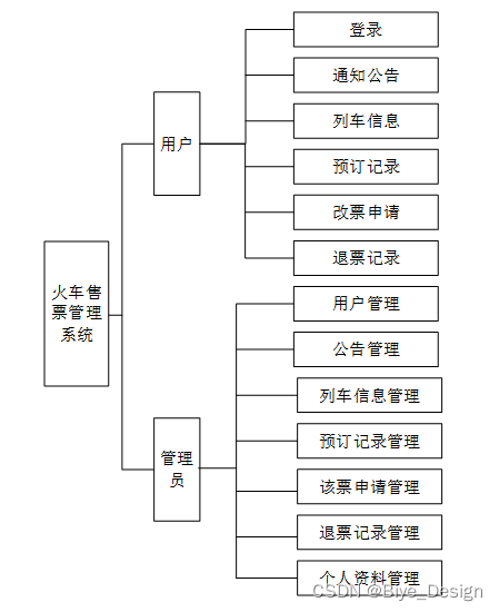 火车售票管理系统总体分为用户模块和管理员模块。