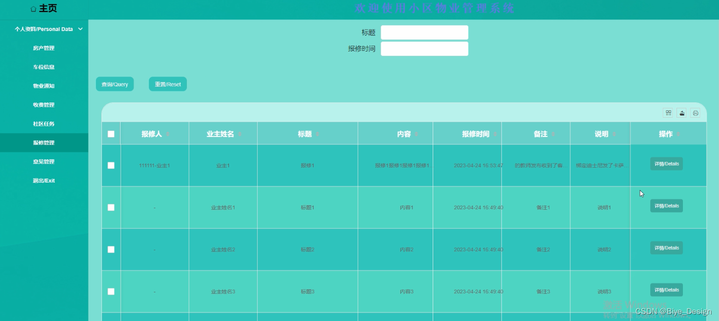 小区物业管理系统的详细设计与实现主要是根据前面的小区物业管理系统的需求分析和小区物业管理系统的总体设计来设计页面并实现业务逻辑。主要从小区物业管理系统界面实现、业务逻辑实现这两部分进行介绍。