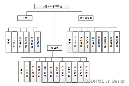 系统的整体架构确定以后,再来看小区物业管理系统的主要功能模块图。整体的功能模块包括管理员+业主+物业管理者三个模块,实现的模块主要有首页、个人资料、用户管理(管理员、业主用户、物业管理者)权限管理(权限列表)房产管理、车位信息、物业通知、收费管理、社区任务、报修管理、意见管理、收费项目等。
