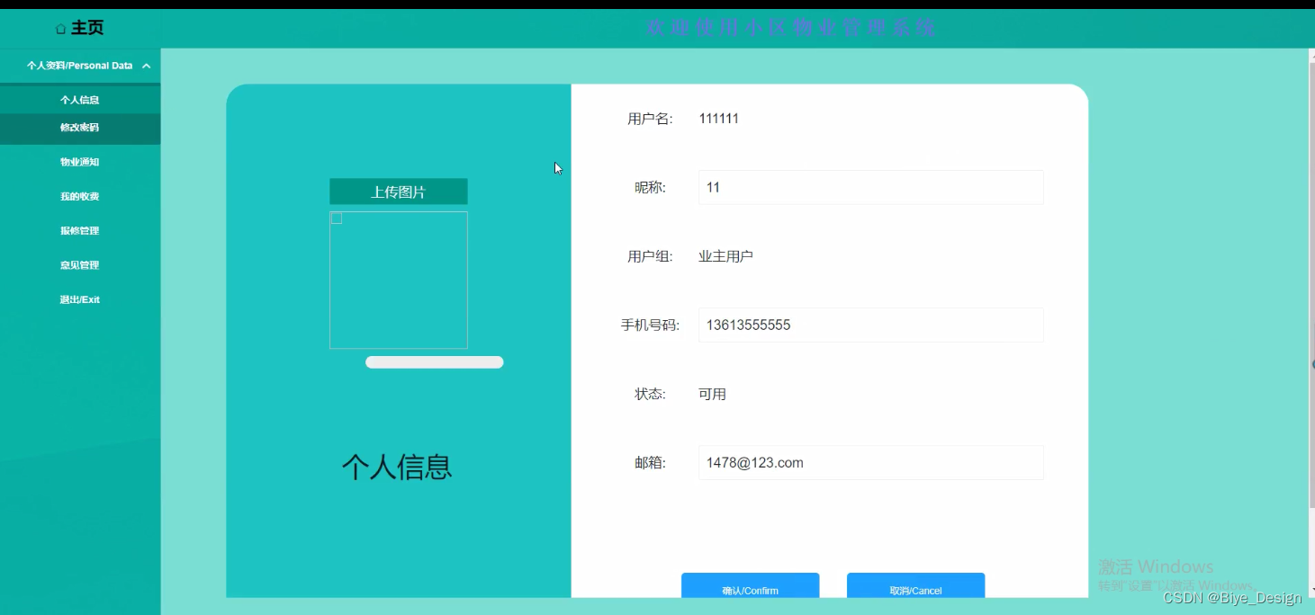 当业主点击左上角“个人资料”这个按钮,会出现子菜单,点击“个人信息”可以对个人的资料以及登录系统的密码进行设置,我的账户界面如下图5.5所示。