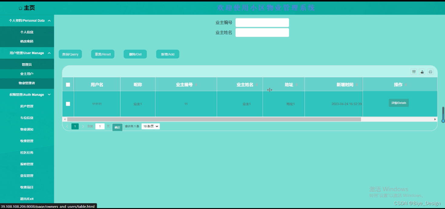 用户管理模块包含了管理员、物业管理者、业主用户三个部分,管理员可以查看到业主的信息,但是只有管理员可以对业主进行增删改查操作,界面如下图5.10所示。