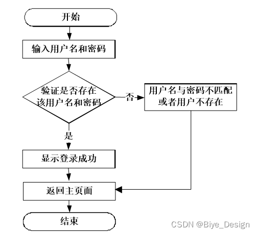 用户登录流程:用户只有输入正确的用户名和密码才会成功进入系统,用户输入用户名密码后点击登录按钮,系统会进行校验该用户名是否存在,如果用户名与密码不匹配或者用户名不存在,则返回主界面。