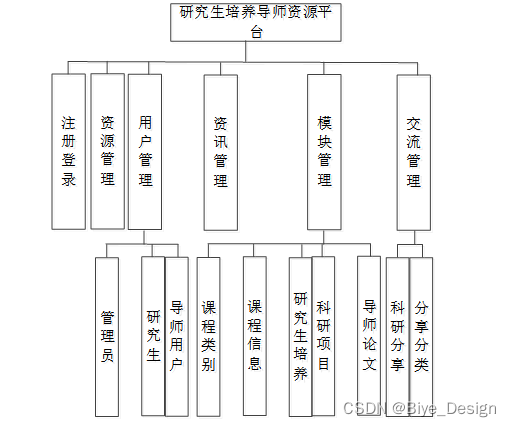 研究生培养导师资源平台的开发主要是最快地速度响应老师和学生的需求,及时为他们提供服务,为他们提供一个高效,便捷的平台。因此在功能上主要规划了研究生模块、导师用户模块以及管理员模块三部分。