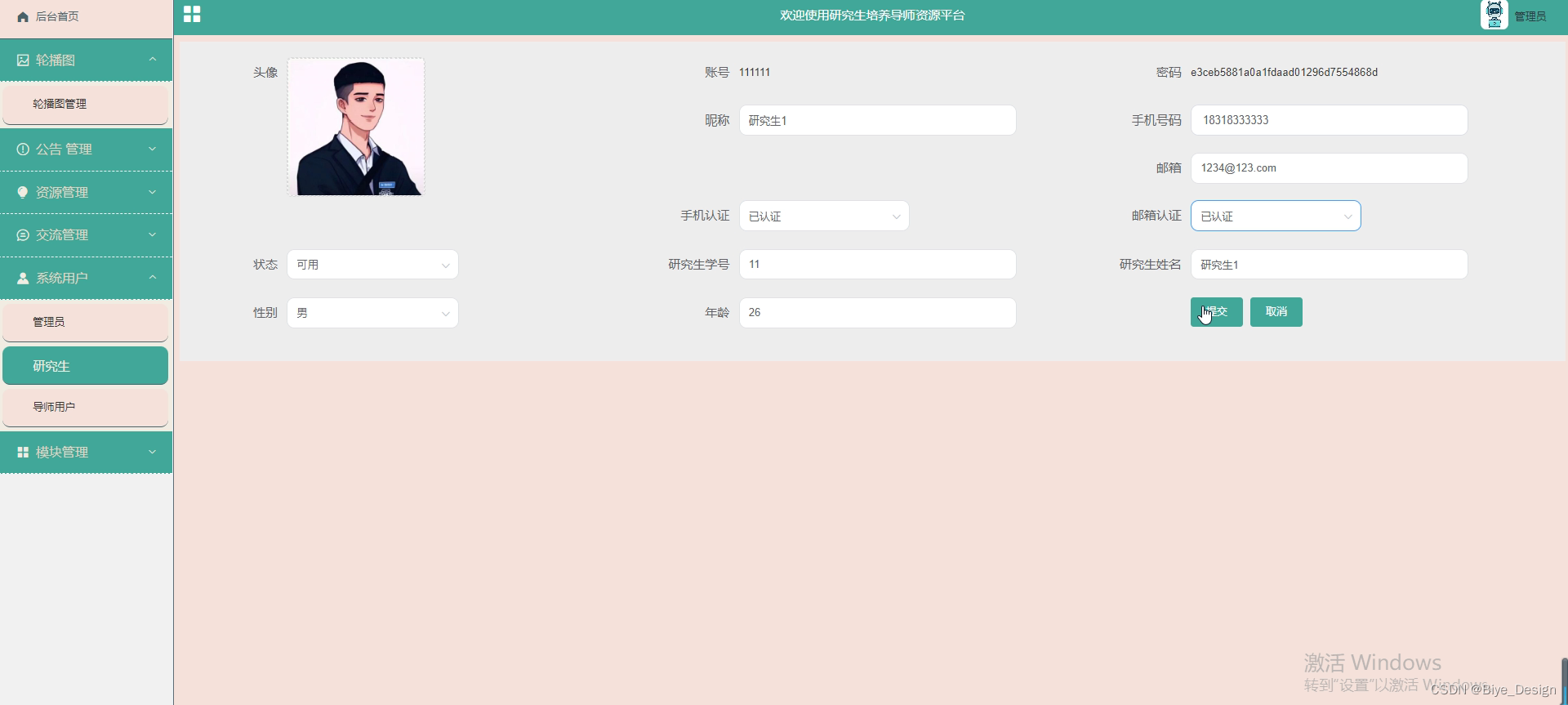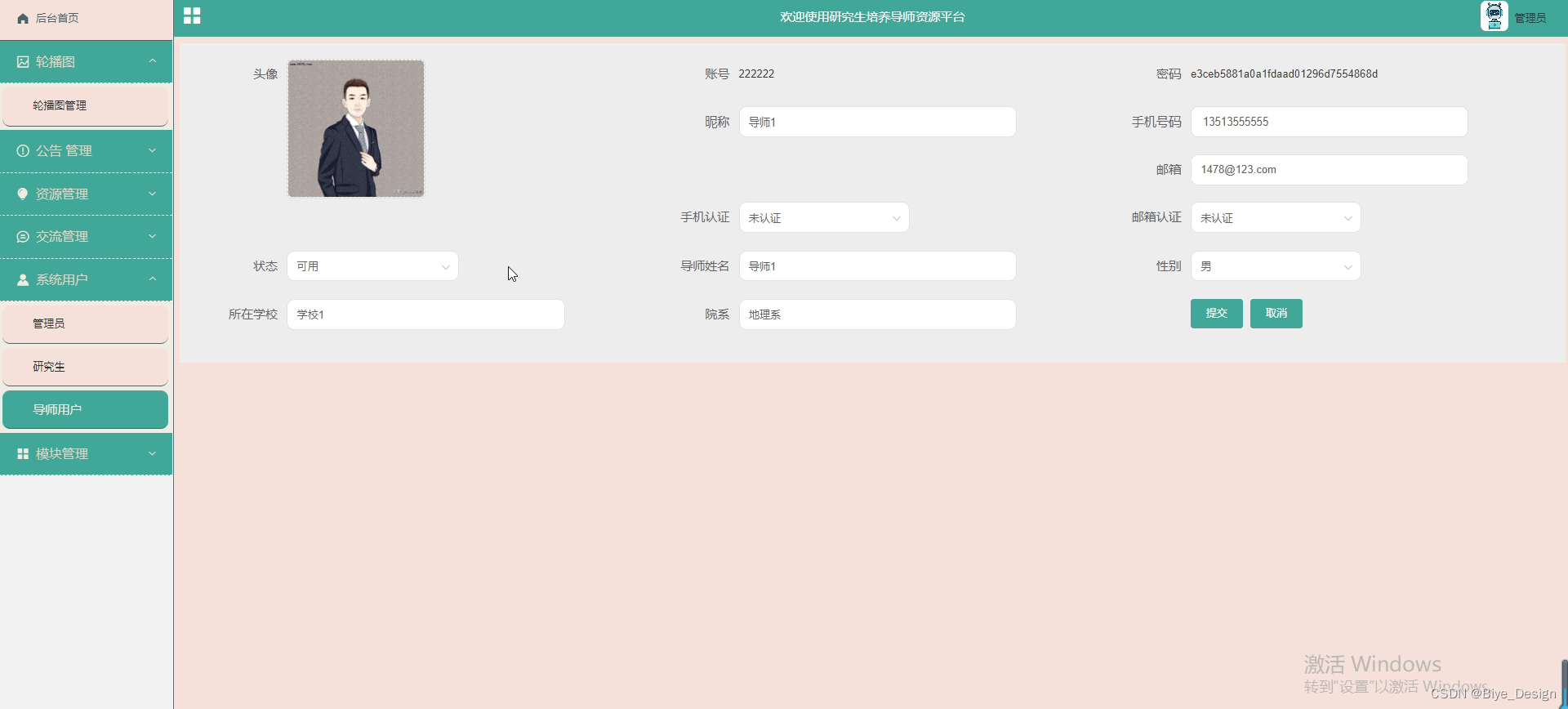 经过了几个月的努力,研究生培养导师资源平台终于完成了,虽然在校期间也开发过一些小型的系统,但是都是在老师的讲解以及辅助下完成的,没有经历过开发之前的需求分析、系统分析,都是直接从系统设计开始的,因此本次开发的研究生培养导师资源平台对我意义重大。