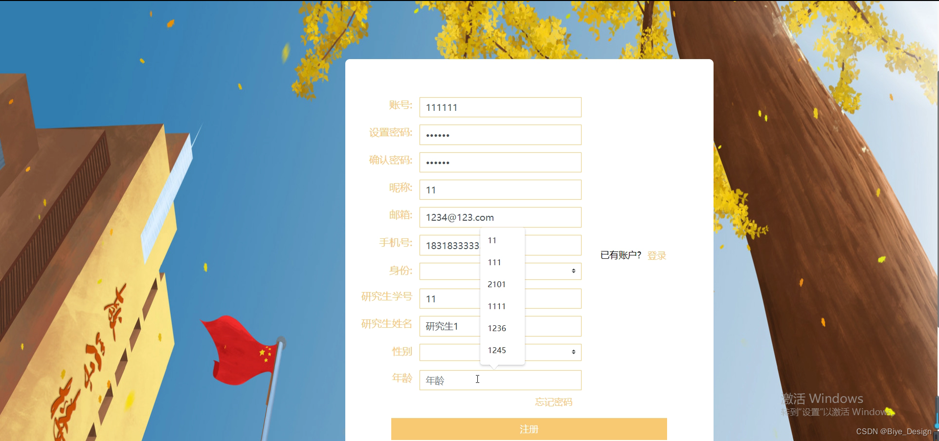 研究生用户这一角色实行“注册”操作,新人没有账号,可以进入到系统的登录页面,然后点击下方的“注册”按钮,根据对应的提示输入正确的学生信息进行注册。注册成功后由管理员进行审核,审核通过方可登录,注册界面如下图4.2所示。