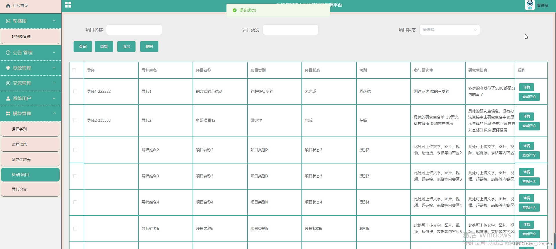 管理员点击“模块管理”菜单下的“课程类别”按钮可以查看到加过的所有的课程类别,如果想要填写新的课程类别,点击右上角“添加”按钮,然后输入类型等信息,点击“提交”按钮进行提交,选择某一课程类别,点击后面的“详情”按钮,可以查看课程类别详情,可以对课程类别进行更改,点击“科研项目”按钮,可以对科研项目进行查看。对导师发布的科研项目进行维护管理。界面如下图4.6所示。