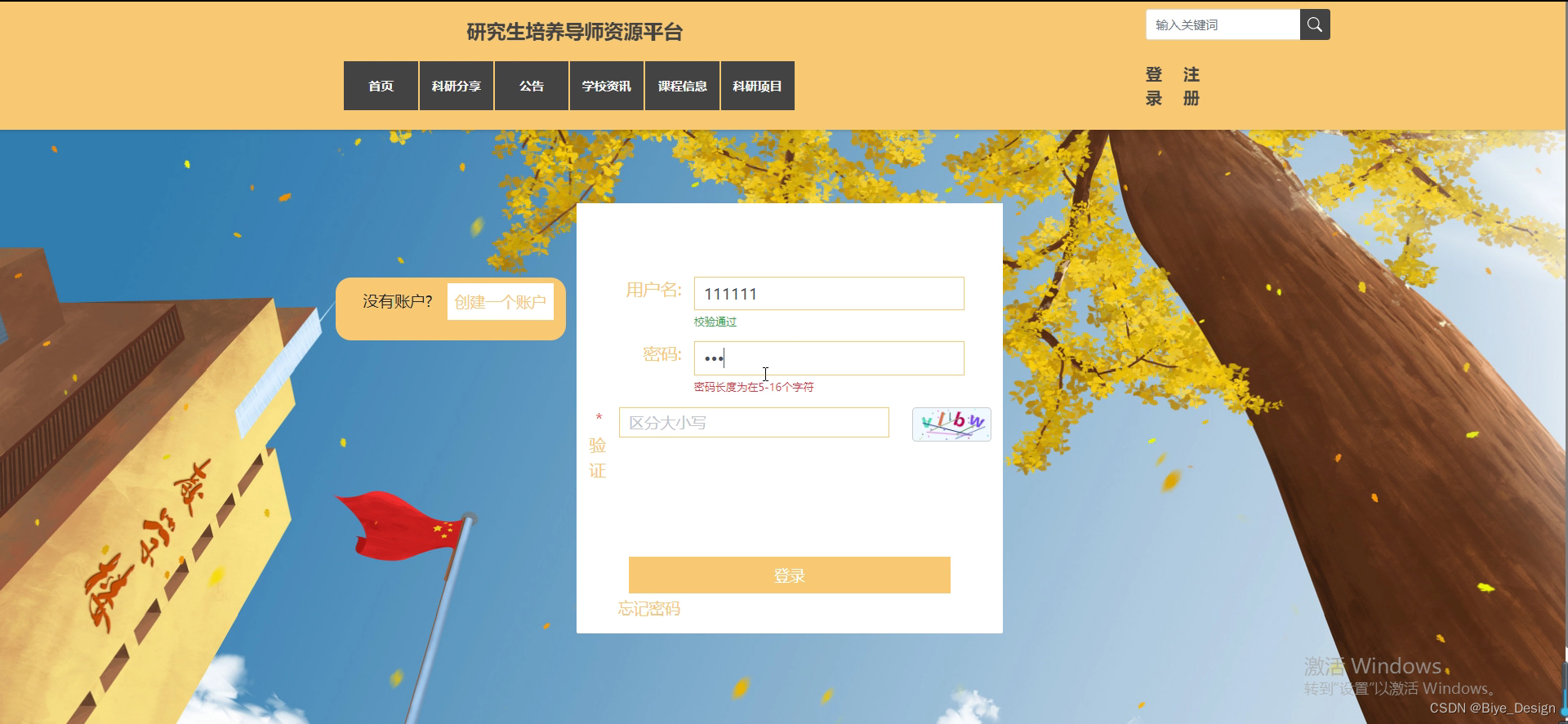 研究生的账号由自己注册的,如果一开始没有账号,可以在登录界面,点击“注册”按钮,然后输入学生的信息,点击注册按钮进行注册,只有注册成功以后,才可以通过账号密码可以登录到系统中,进行相关操作—科研分享、公告以及学校资讯信息查看、课程信息以及科研项目查询、导师论文等。