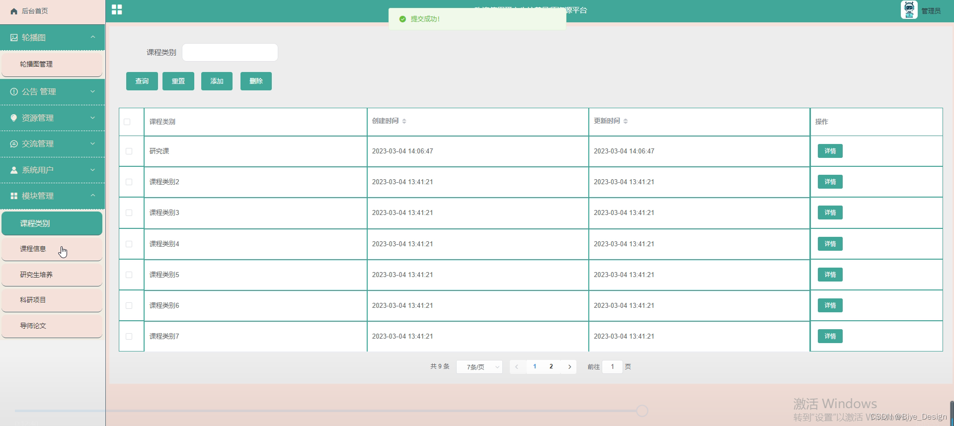 管理员点击“模块管理”菜单下“课程信息”按钮可以查看到导师用户发布的所有课程信息,如果想要新增新的课程信息,点击右上角“添加”按钮,然后输入课程信息,点击“提交”按钮进行提交,选择某一课程信息,点击后面的“详情”按钮,可以查看课程信息详情,同时也支持对已有的课程信息进行删除和查询。课程信息界面如下图4.4所示。