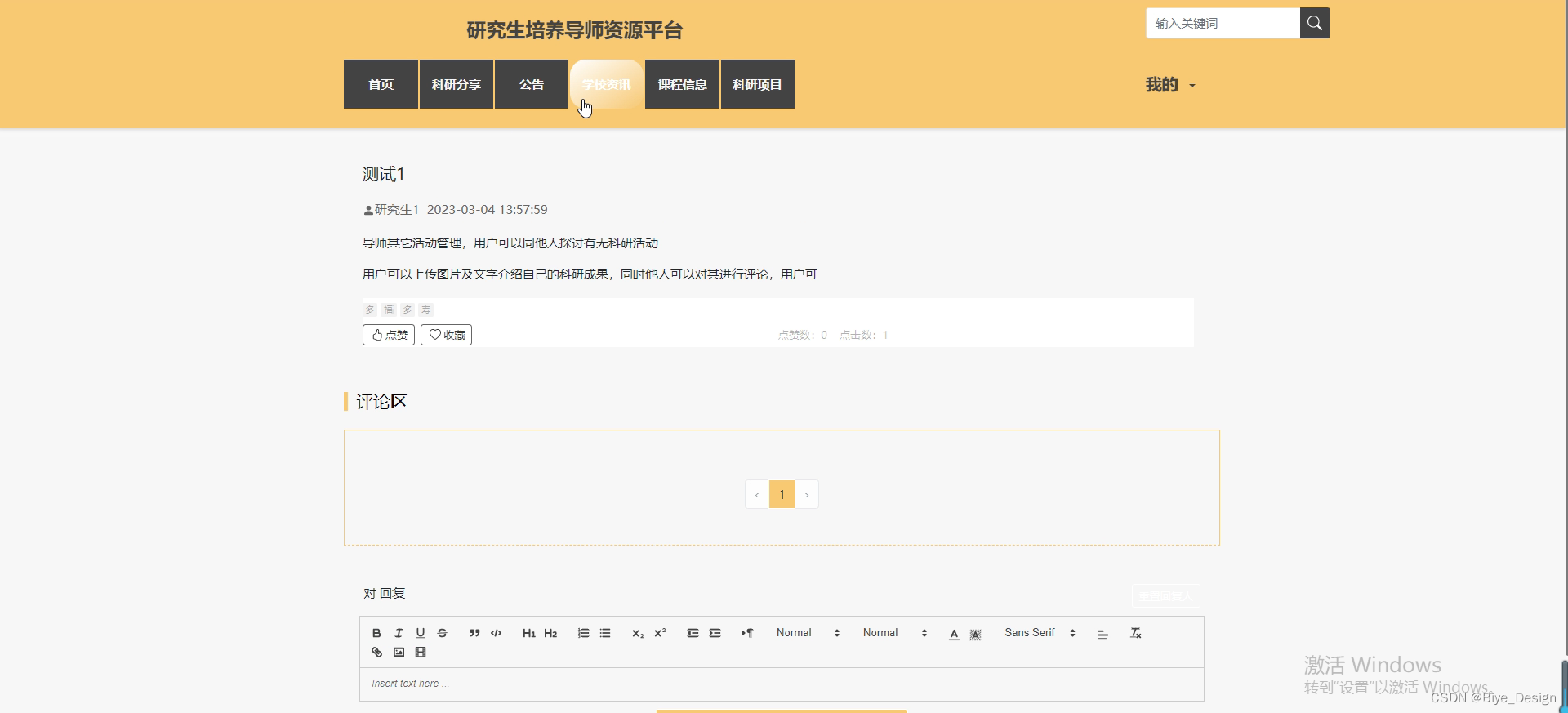 研究生点击“学校资讯”按钮能够看到系统发布的学校资讯信息,点击“详情”可以对学校资讯进行查看还可以进行评论发布。界面如下图4.11所示。