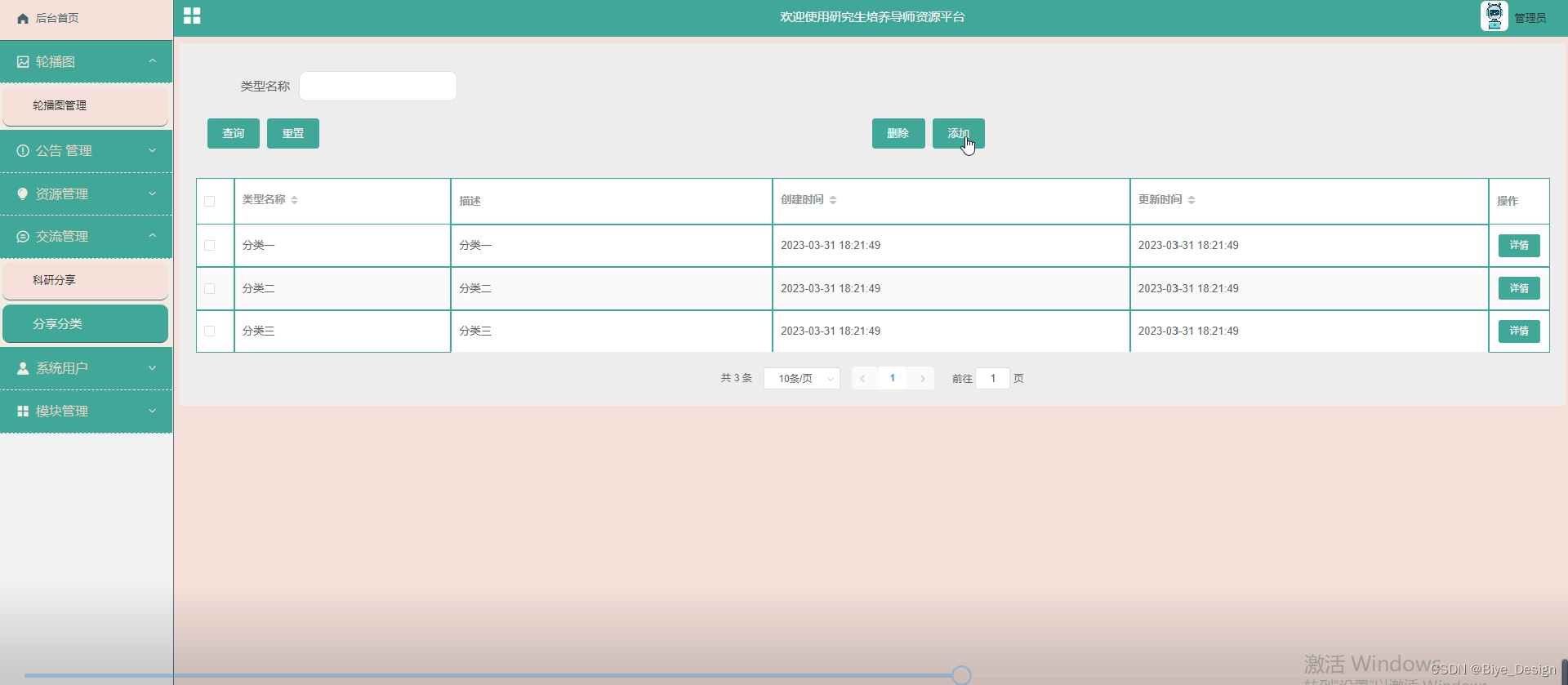 管理员点击“交流管理”按钮可以查看到科研分享信息以及分享分类,可以对这两个模块进行维护管理。交流管理界面如下图4.10所示。