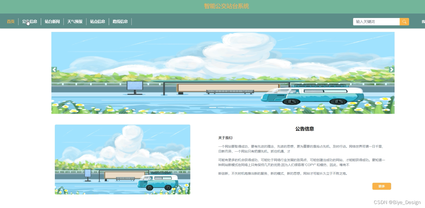 当用户访问智能公交站台系统时,会发现它的导航栏上有轮播图,并且提供了丰富的系统内容。主界面如图4-1所示。