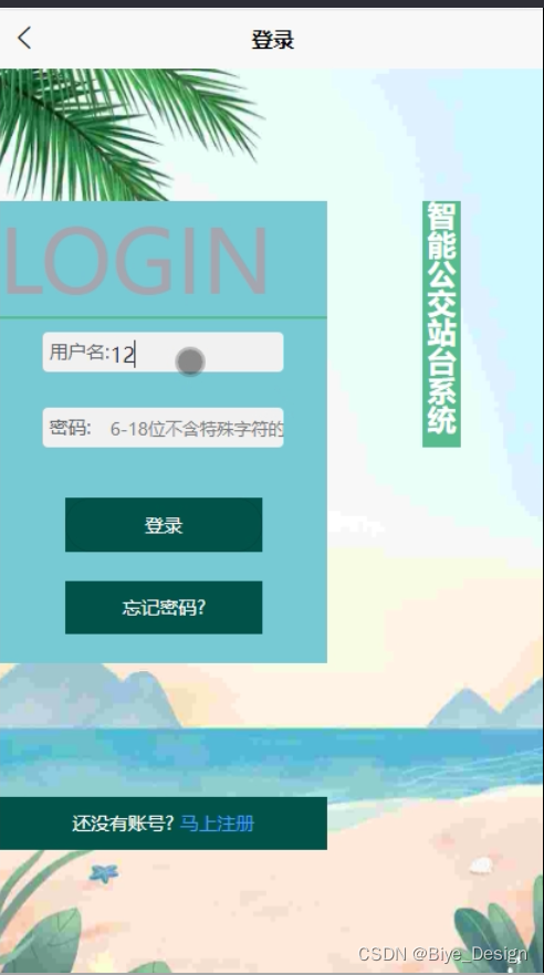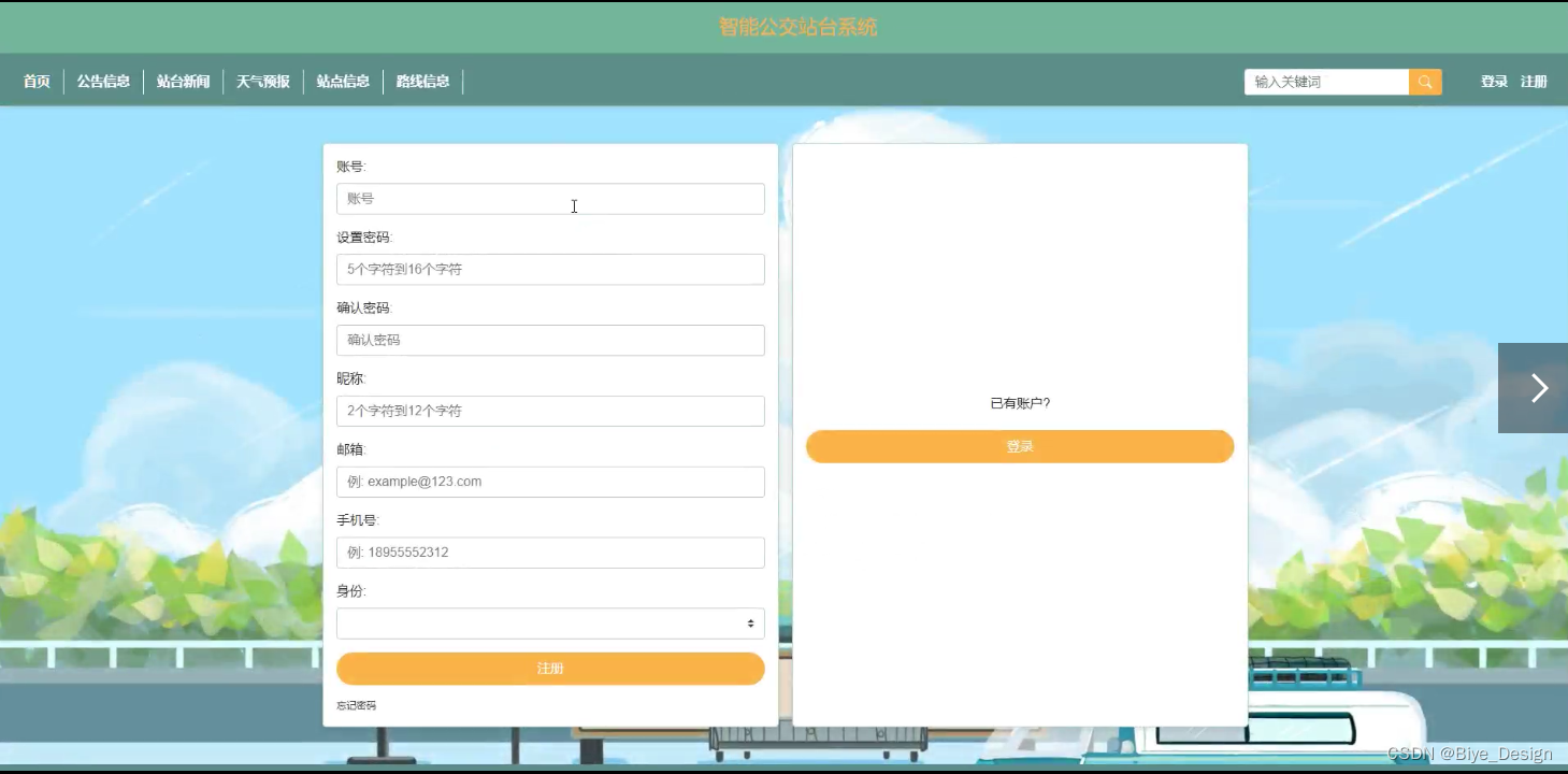 智能公交站台系统中的前台上注册后的用户是可以通过自己的账户名和密码进行登录的,当用户输入完整的自己的账户名和密码信息并点击“登录”按钮后,将会首先验证输入的有没有空数据,再次验证输入的账户名+密码和数据库中当前保存的用户信息是否一致,只有在一致后将会登录成功并自动跳转到智能公交站台系统的首页中;否则将会提示相应错误信息,用户登录界面如下图4-3所示。