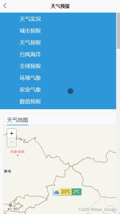 (7)天气预报:点击“天气预报”按钮后显示出后台(管理员)发布的所有的天气预报,用户可以搜索省份、城市天气预报方便更快的找到,也可以查看天气预报信息图片信息。
