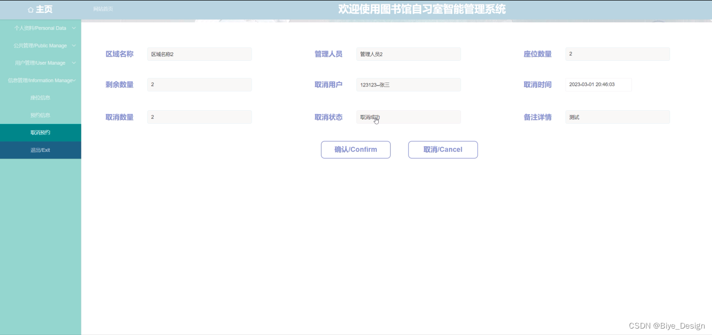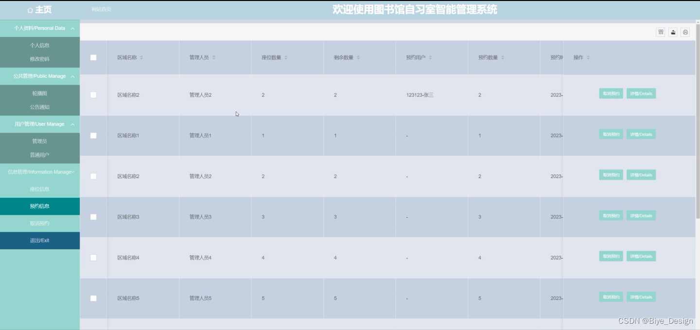 预约信息:管理员在此页面可查看区域名称、管理人员、座位数量、剩余数量、预约用户、预约数量、预约时间等详细信息,可根据情况进行详情、取消预约等操作,如图5-12 5-13所示。