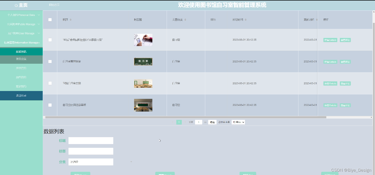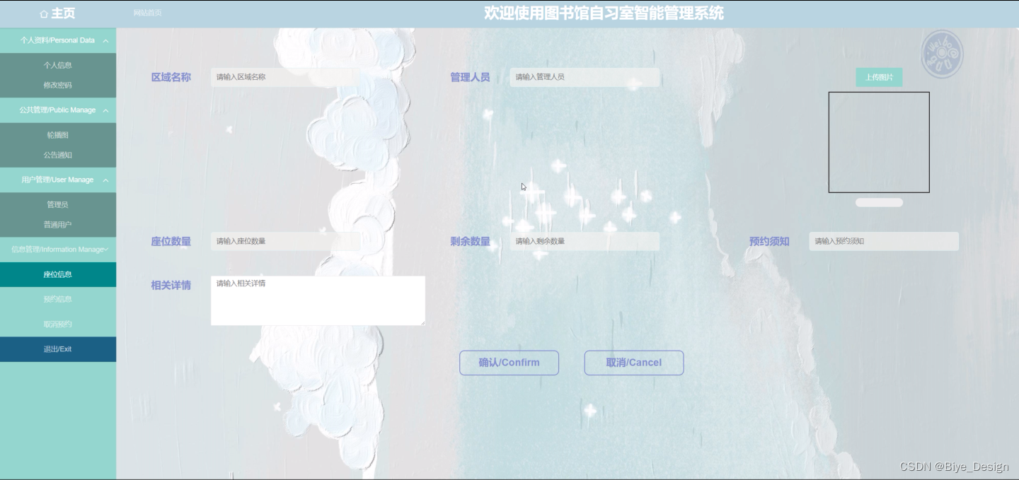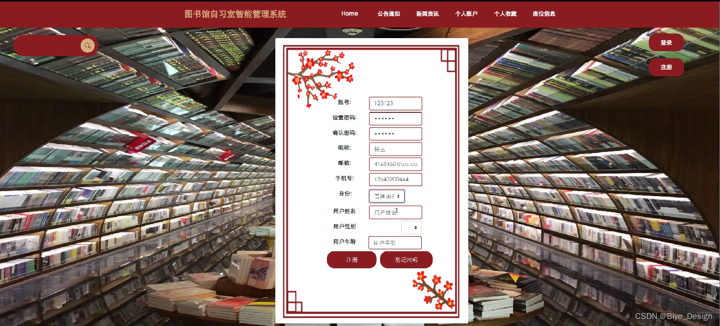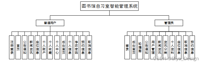 (1)功能要求:主页、个人资料、轮播图管理、公告通知管理、用户管理(管理员、普通用户)信息管理(新闻资讯、资讯分类)预约信息、取消信息、座位信息等功能模块。