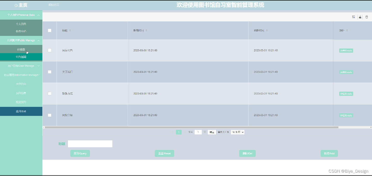 公告通知管理:管理员在这一栏可以编辑标题+内容进行发布、查询、重置、删除、添加等操作,如图5-7,5-8所示。