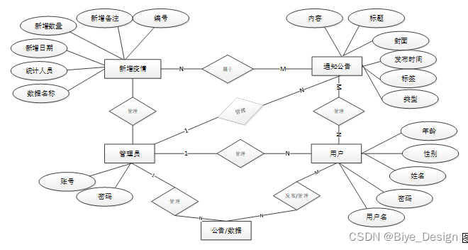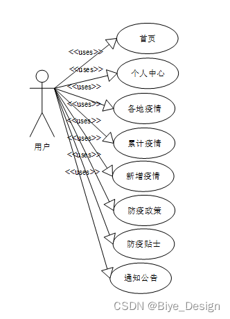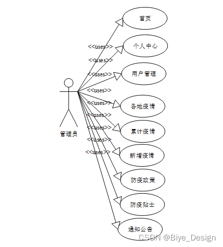疫情数据可视化系统的功能主要分为用户根据自己的需求进行注册登录,浏览通知公告信息并对选中的通知公告进行浏览等操作。后台系统管理员因职责的不同,管理员主要对各地疫情、累计疫情、新增疫情、防疫贴士、防疫政策、通知公告进行处理。