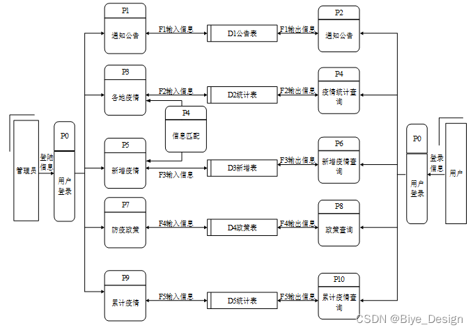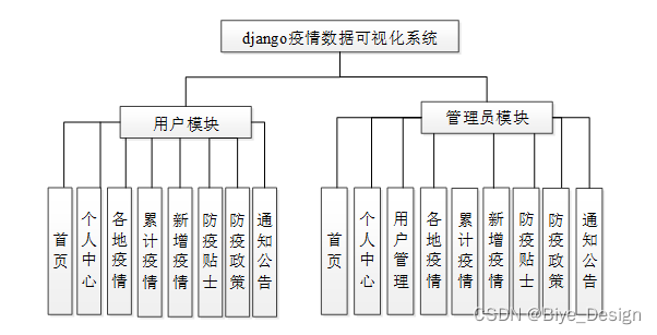 疫情数据可视化系统总体分为用户模块和后台管理员模块。