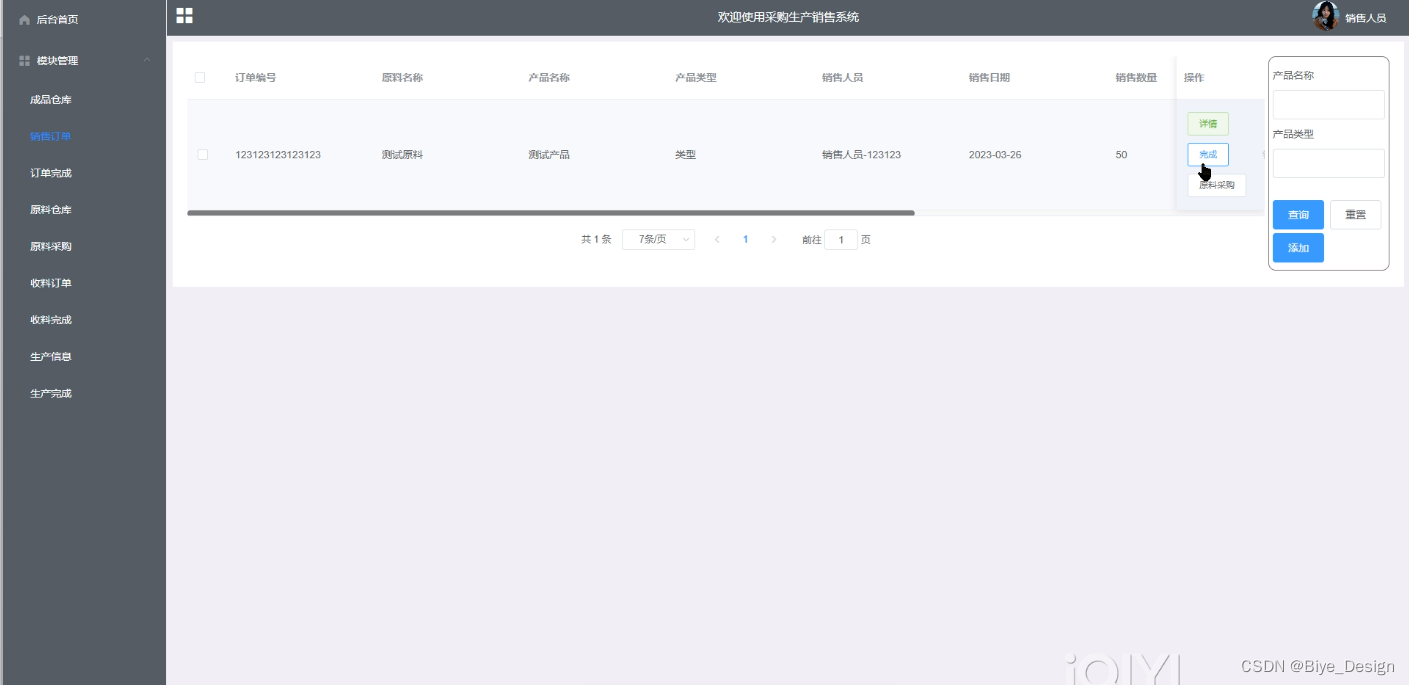 销售订单,在销售订单页面中可以填写订单编号、原料名称、产品名称、产品类型、销售人员、销售日期、销售数量等信息,并进行完成、原料采购、添加、删除等操作,如图5-7所示。