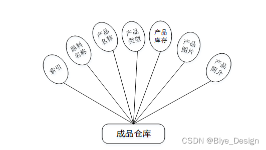 成品仓库管理主要包括索引、原料名称、产品名称、产品名称、产品类型、产品库存、产品图片、产品简介等属性,成品仓库管理属性图如图4-5所示。