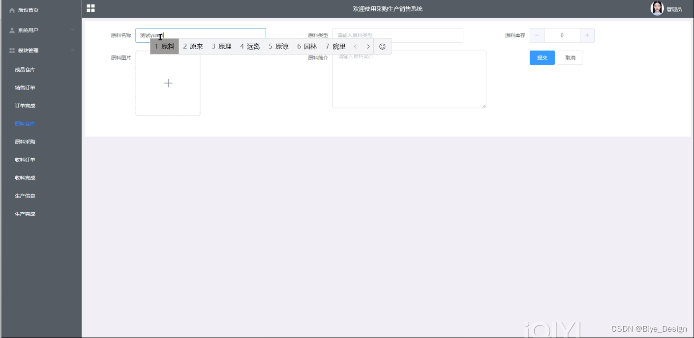 生产人员登录进入采购生产销售系统可以对首页、个人中心、模块管理(成品仓库、原料仓库、原料采购、收料订单、收料完成、生产信息、生产完成)等进行相应的操作管理,如图5-6所示。