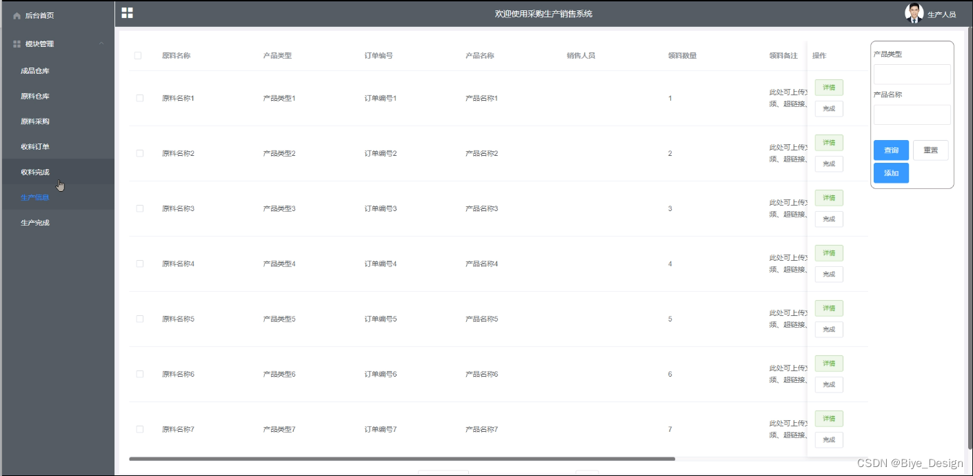 生产信息,在生产信息页面中可以填写原料名称、产品类型、订单编号、产品名称、销售人员、领料数量、领料备注等信息,并进行完成、添加、删除等操作,如图5-7所示。