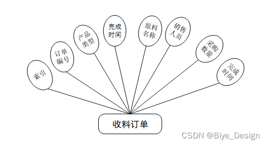 收料订单管理实体属性主要包括索引、订单编号、产品类型、完成时间、原料名称、销售人员、产品名称、采购数量等属性。收料订单管理实体属性图如图4-6所示。