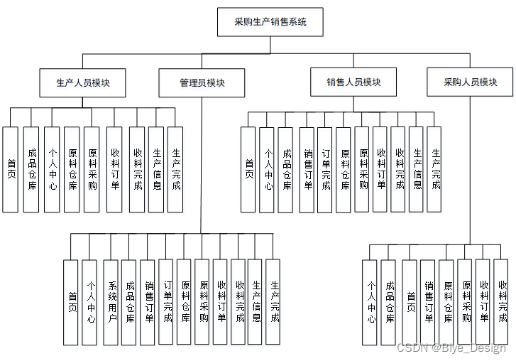 The system adopts a B/S structure, using a browser interactive mode for all business modules, selecting MySQL as the system database, and selecting My Eclipse as the development tool to design the system. The main functional modules of the purchase, production, and sales system have been basically implemented. The system includes four functional modules: administrator, salesperson, purchaser, and production personnel. The administrator: background homepage, system users (administrator, salesperson, purchaser, and production personnel) Module management (finished product warehouse, sales order, order completion, raw material warehouse, raw material procurement, material receipt order, material receipt completion, production information, production completion), personal center, and other operations.