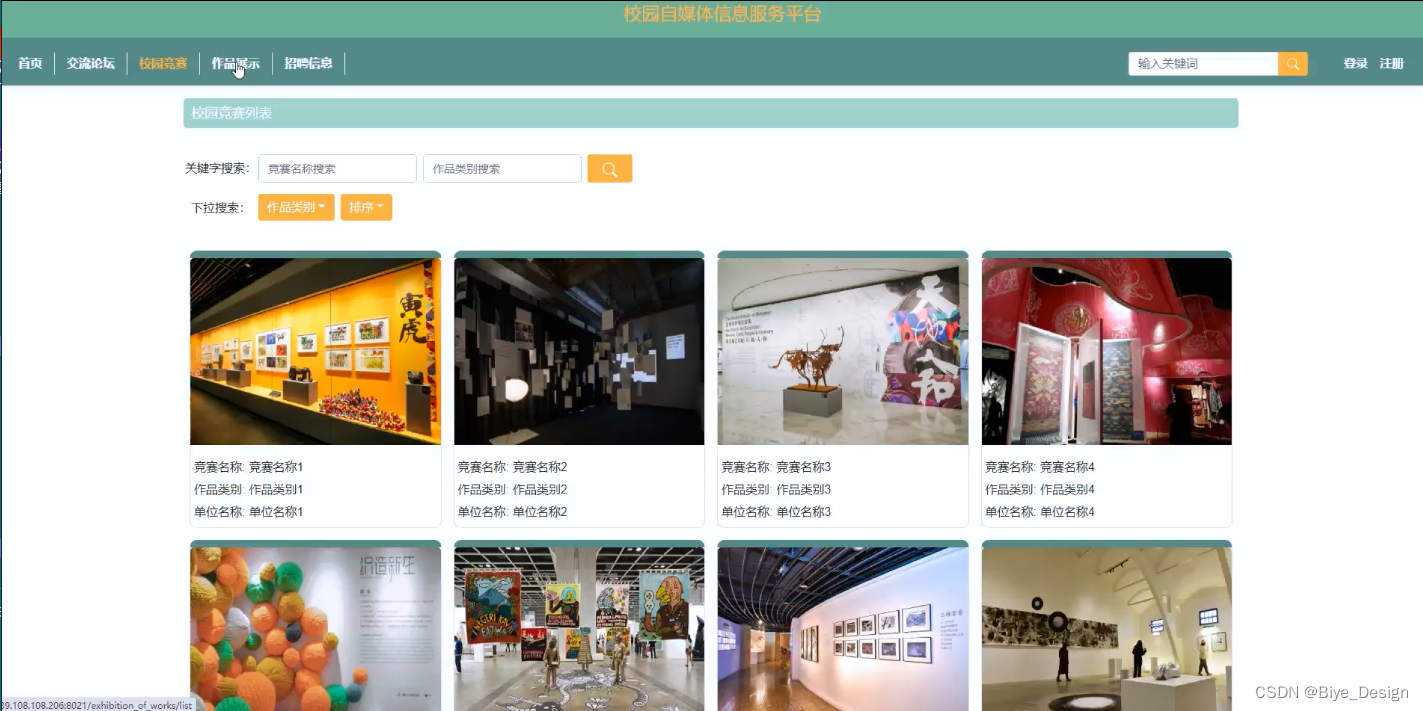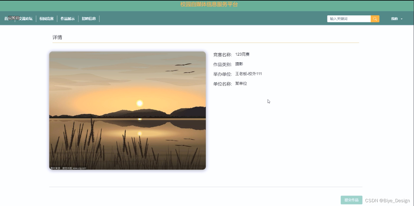 (3)校园竞赛:用户点击“校园竞赛”菜单可以查看所有校园竞赛信息,可以按照条件查看校园竞赛,或者输入关键词进行查询,点击可以进入校园竞赛详细展示界面,在此界面用户可以评论。
