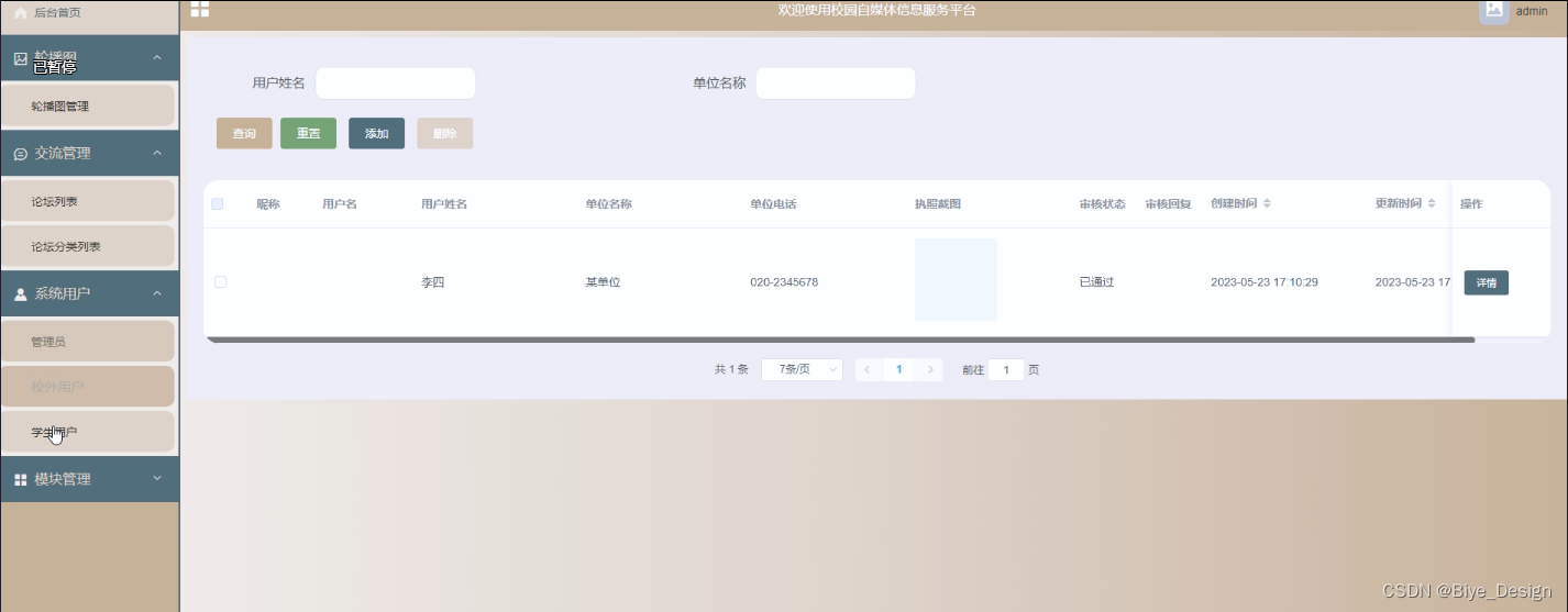 (4)系统用户:管理员点击“系统用户”菜单可以对系统中存在的用户进行管理,包含了管理员用户、校外用户和学生用户。