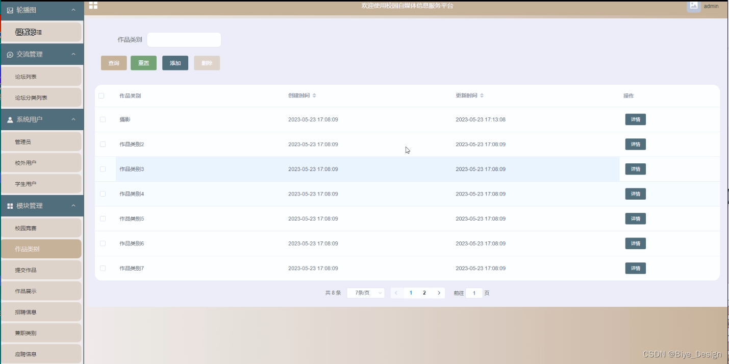(5)模块管理:在“模块管理”这一菜单下,我们会看到校园竞赛、作品类别、提交作品、作品展示、招聘信息、兼职类别、应聘信息,管理员可以对其进行增删改查操作。