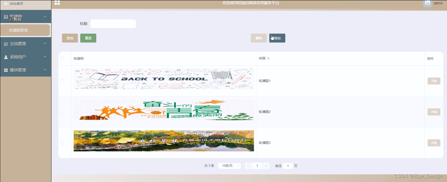 (2)轮播图:管理员点击“轮播图”菜单可以对首页展示的轮播图进行增删改查。