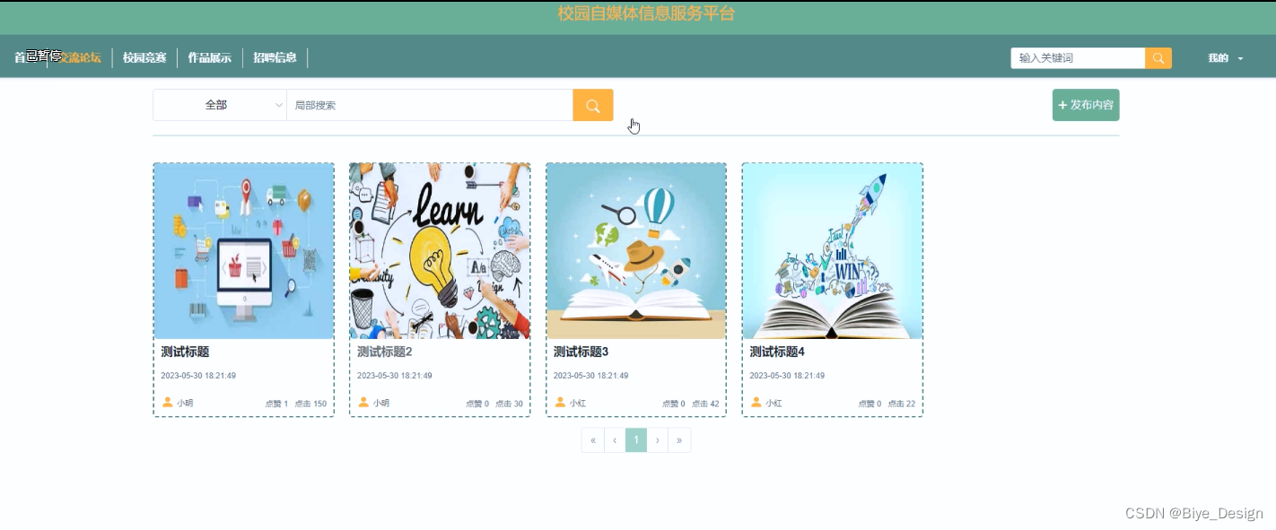 (2)交流论坛:用户点击“交流论坛”菜单显示所有的交流论坛信息,可以按照分类查看帖子信息,或者输入关键词进行局部搜索,点击可以进入帖子的详细展示界面,在此界面用户可以点赞、收藏、评论,也可以点击“发布内容”输入帖子信息进行发帖。
