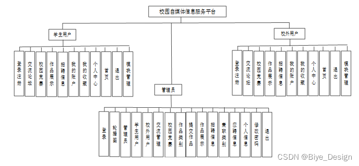 按照校园自媒体信息服务平台的角色,我划分为了管理员、学生用户以及校外用户这三大部分。