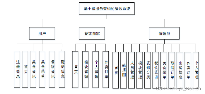 (1)功能要求:主要功能包括首页、网站管理(轮播图、通知公告)、内容管理(餐饮资讯、资讯分类)、人员管理(管理员、普通用户、餐饮商家)模块管理(菜品分类、美食菜单、堂食订单、出餐信息、外卖订单、配送信息、取消订单)等功能模块。