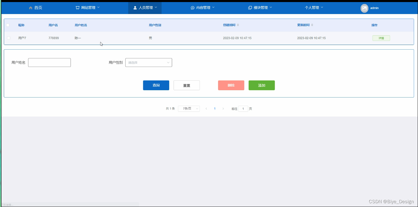 人员管理,在人员管理页面可以查看用户姓名,用户性别,昵称、用户权限等内容,可以进行通过输入用户ID,用户名,用户密码和选择角色添加用户。如图5-3所示。