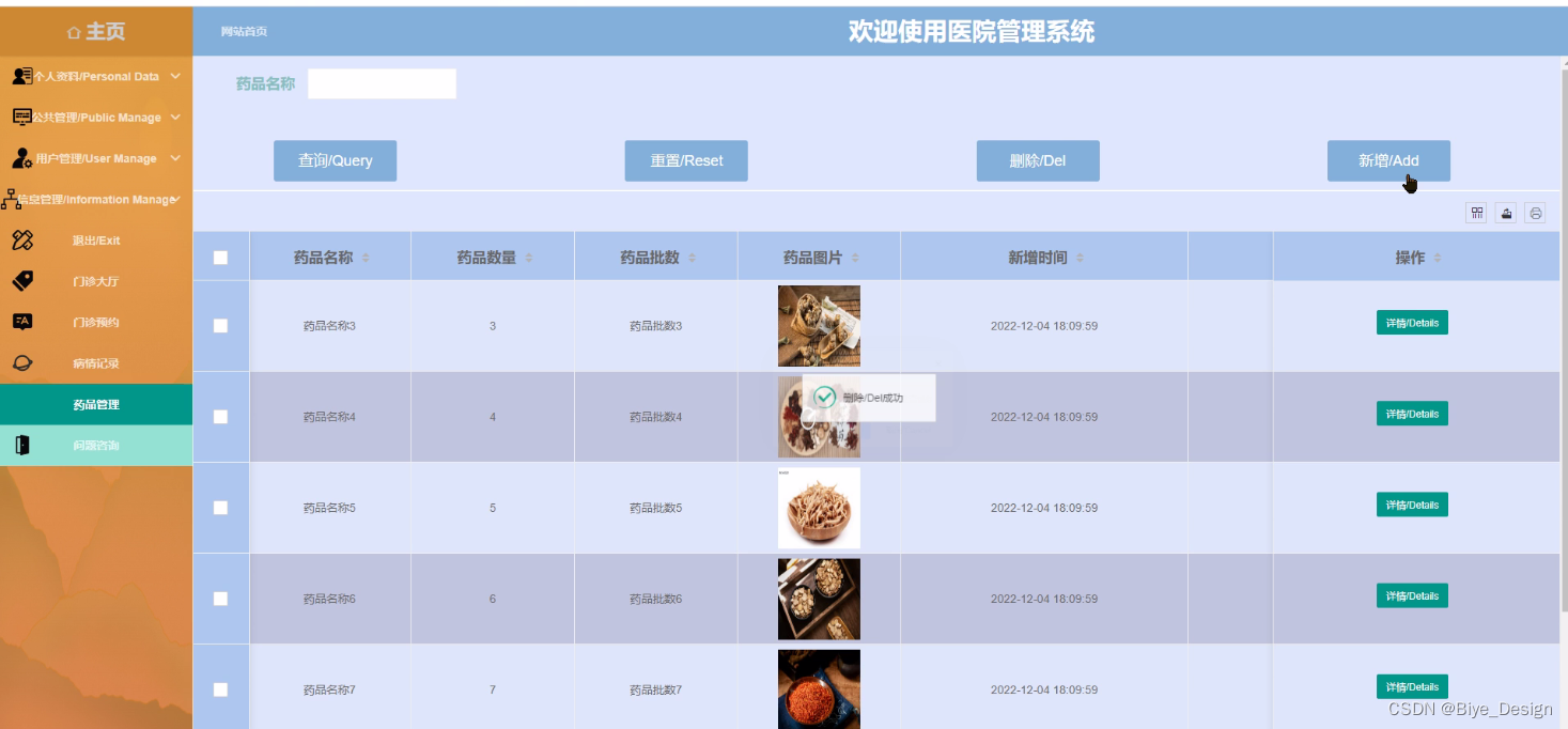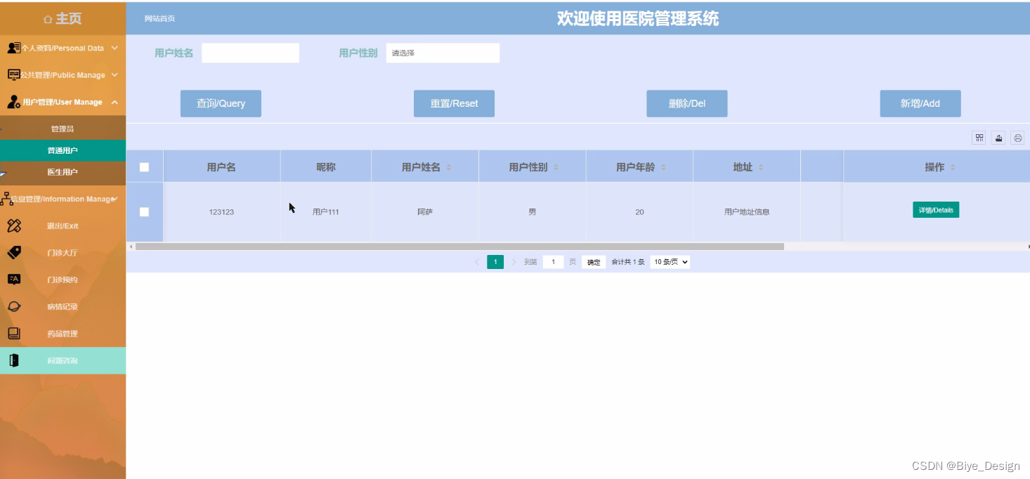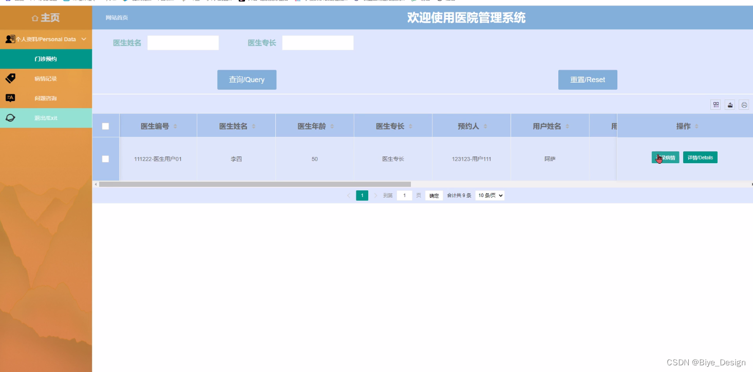 This design mainly achieves hospital management that combines the advantages of humanization, efficiency, and convenience. It completes functional modules such as homepage, personal information, public management (broadcast images, bulletin boards), user management (administrators, ordinary users, doctor users), information management (hospital information, hospital information list), outpatient hall, outpatient appointment, disease record, drug management, and problem consultation. The system communicates with the server through a browser to achieve data interaction and changes. You only need to use a computer and move your fingers to operate the system, achieving data communication management. The entire system design process fully considers issues such as data security, stability, and reliability, and the operation process is simple. This system improves work efficiency and reduces errors and omissions in data storage through scientific management and convenient services.