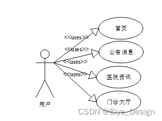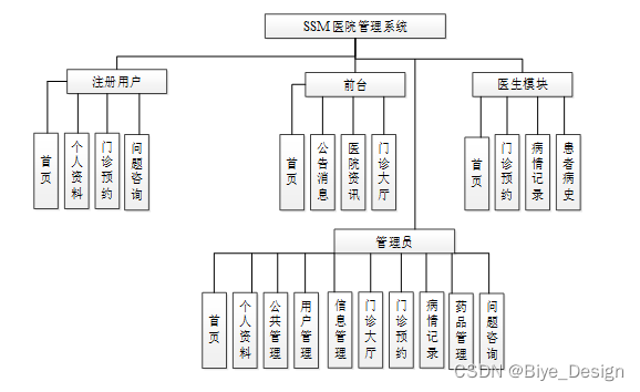 系统设计的目的是分析系统包括的所有功能结构,为开发人员设计开发和实现系统做好准备工作。经过前期的需求调查、分析和整理之后,确定的总体需求主要包括多个模块,分别是:首页、个人资料、公共管理(轮播图、公告栏)用户管理(管理员、普通用户、医生用户)信息管理(医院资讯、医院资讯列表)门诊大厅、门诊预约、病情记录、药品管理、问题咨询。系统整体角色分为三个部分,一是注册用户、二是医生、最后是管理员。权限分布也是很明显,用户是在除去浏览信息之外还具有查询和管理自己账户信息、请预约挂号、预约信息、患者病史等权限;管理员是最高权限拥有者。