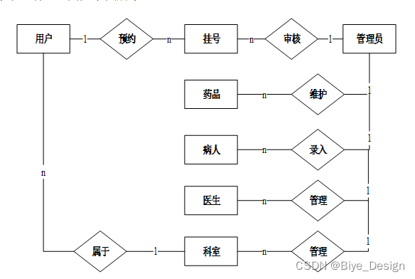 对于一个要开发的系统来说,E-R图可以让别人能更快更轻松的了解此系统的事务及它们之间的关系。根据系统分析阶段所得出的结论确定了在医院管理中存在着多个实体分别是用用户、管理员、药品、医生、预约挂号、预约信息。