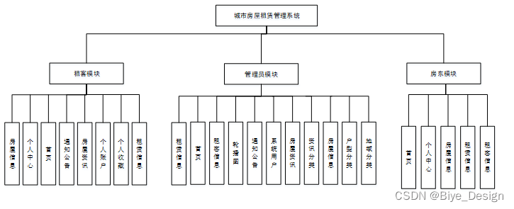 本城市房屋租赁管理系统主要包括三大功能模块,即租客功能模块、管理员功能模块和房东模块。