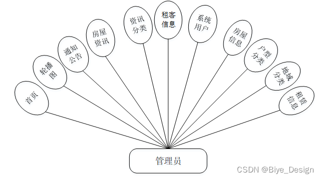 (1)管理员模块:系统中的核心租客是系统管理员,管理员登录后,通过管理员菜单来管理后台系统。主要功能有:首页、轮播图(轮播图管理)、通知公告管理(通知公告)、资源管理(房屋资讯、资讯分类)、系统用户(管理员、租客用户、房东用户)、模块管理(房屋信息、户型分类、地域分类、租赁信息、租客信息)等。管理员用例图如图3-1所示。