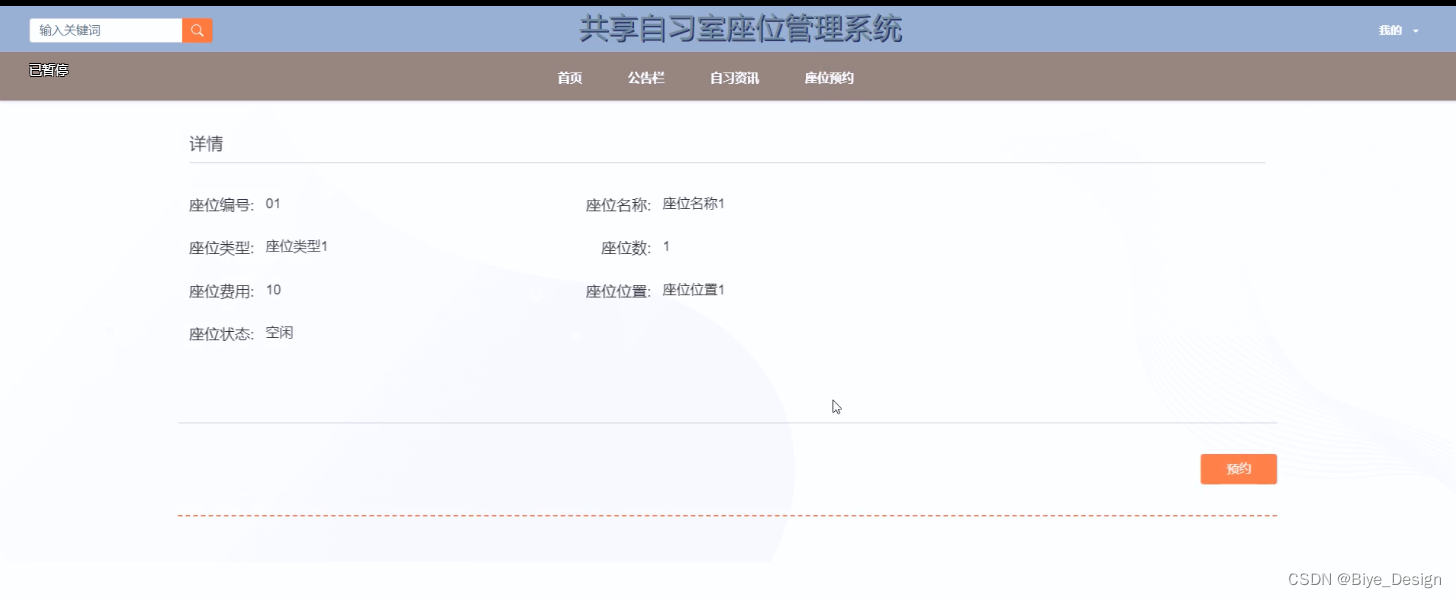 (6)座位预约:用户可以查看座位预约信息支持通过搜索关键词的方式对座位预约进行查询,在查询到自己想要了解的座位预约的时候,可以进入查看详细的介绍。