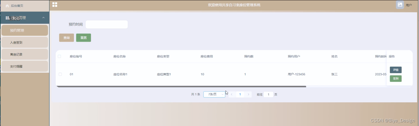This design mainly implements a shared study room seat management system that integrates the advantages of humanization, efficiency, and convenience, and completes functional modules such as seat classification, seat reservation, reservation management, check-in, departure record, payment reminder, and blacklist. The system communicates with the server through a browser to achieve data interaction and change. You can operate the system by moving your fingers through a computer to achieve data communication management. The entire system design process fully considers the issues of data security, stability, and reliability, and the operation process is simple. This system improves work efficiency and reduces errors and omissions in data storage through scientific management methods and convenient services.