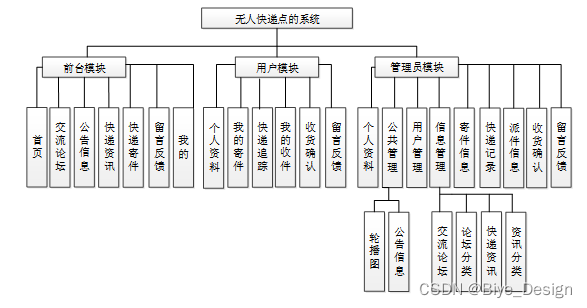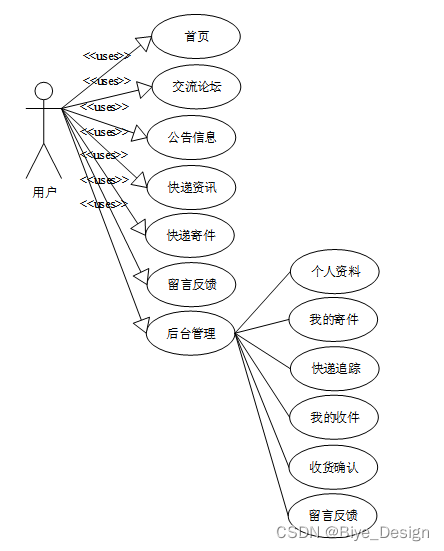 校园快递管理系统在对需求做解析后,整个系统主要分为两个部分:管理员和注册用户,每个模块下的分支功能不一样。对功能做出如下说明: