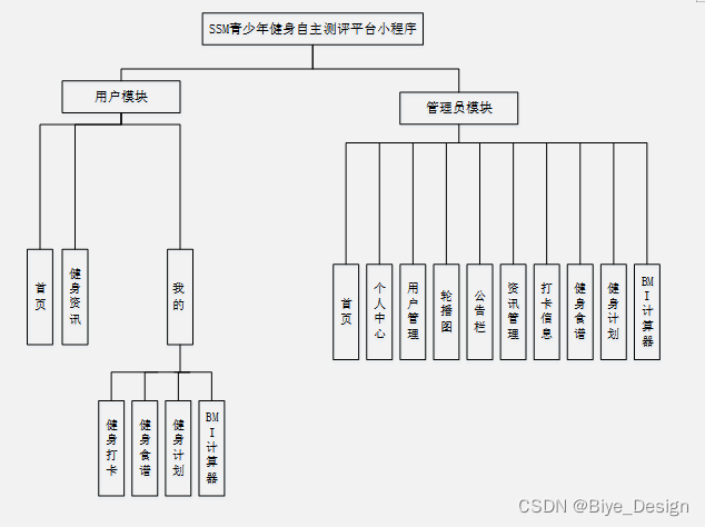 通过使用微信小程序的青少年健身自主测评平台,我们可以实现多种功能,从而满足用户的各种需求。该系统的功能结构如图4-5所示,具有良好的完整性和可靠性。