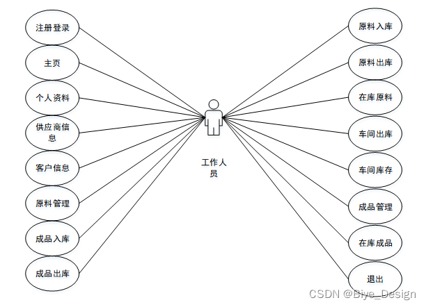 (2)工作人员:主页、个人资料、供应商信息、客户信息、原料管理、原料出库、原料入库、在库原料、车间出库、车间库存、成品管理、成品出库、成品入库、在库成品等功能。工作人员用例图如图3-2所示。