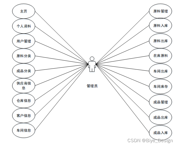 (1)管理员模块:系统中的核心用户是系统管理员,管理员登录后,通过管理员菜单来管理后台系统。主要功能有:主页、个人资料、用户管理、原料分类、成品分类、供应商信息、仓库信息、客户信息、车间信息、原料管理、原料出库、原料入库、在库原料、车间出库、车间库存、成品管理、成品出库、成品入库、在库成品等功能。管理员用例图如图3-1所示。
