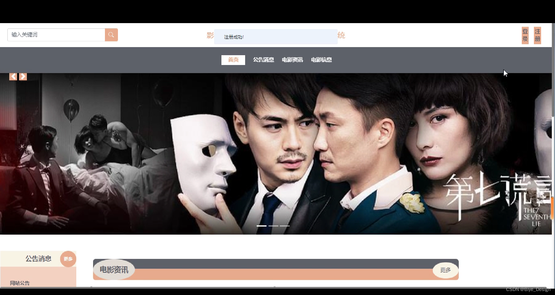 注册用户登录系统可以查看的功能模块有:首页,公告消息,电影资讯,电影信息,我的账户,我的收藏,个人中心等,如下图所示。